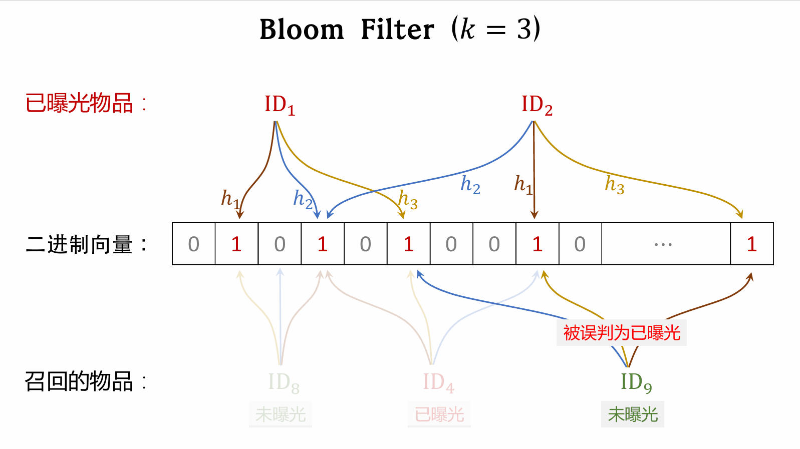 • 曝光物品集合大小为 nn,二进制向量维度为 mm,使用 kk 个哈希函数。