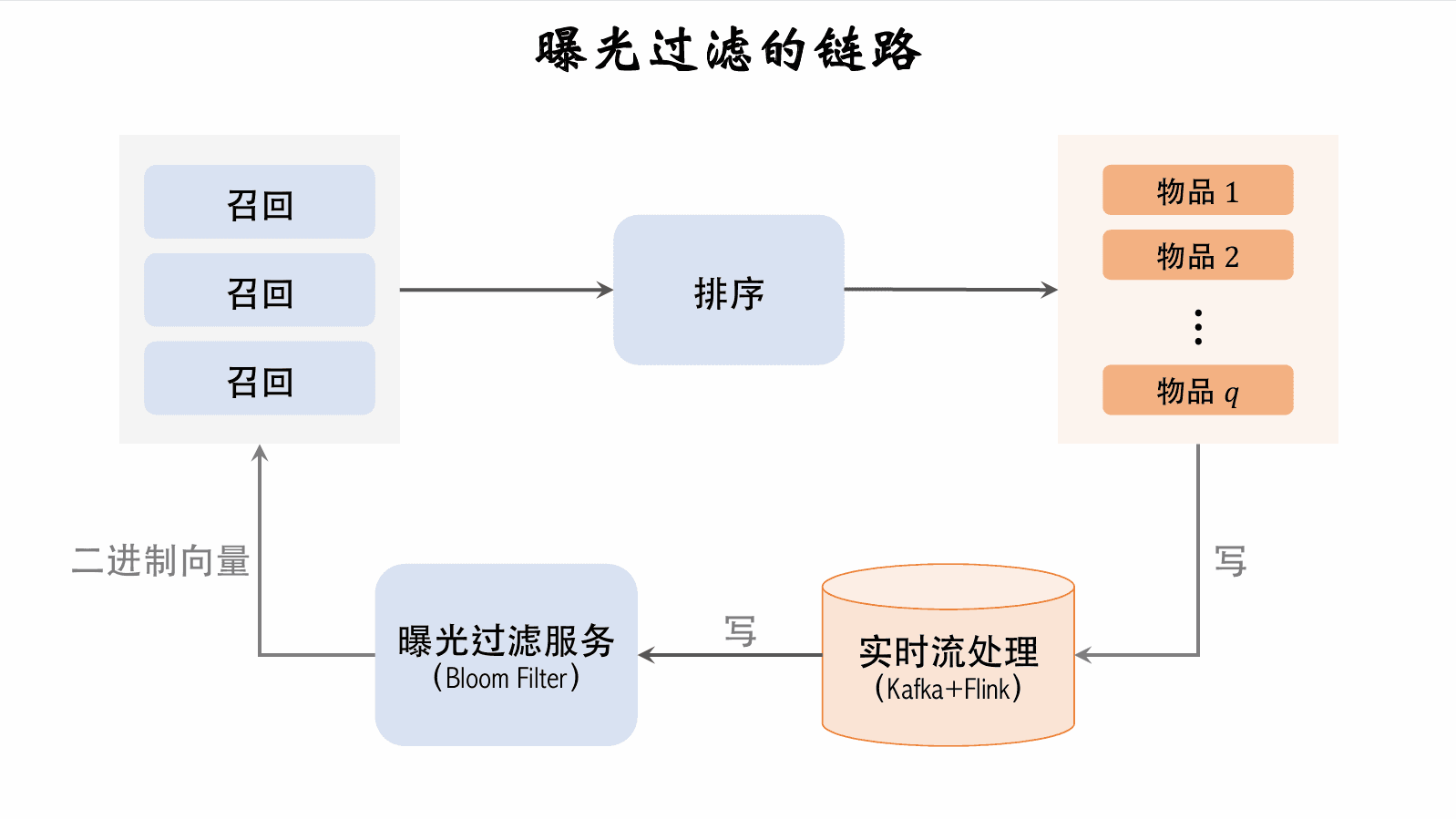 • Bloom filter 判断一个物品 ID 是否在已曝光的物品集合中。